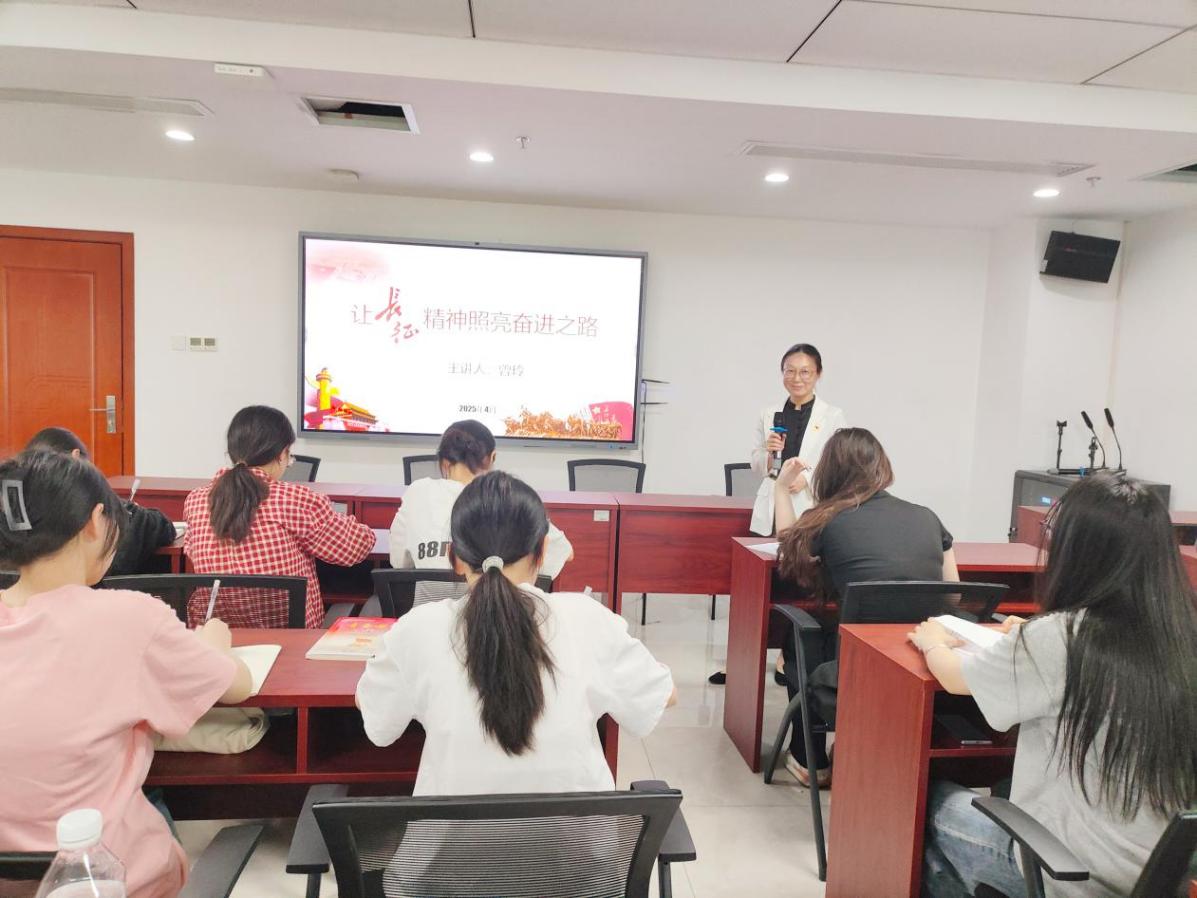 2025年4月21日 香蕉91视频APP,院党委委员,副院长曾玲在终身教育大楼1314讲授以“让长征精神照亮奋进之路”为主题的党课,经济管理香蕉视频黄片分党训第6期全体发展对象共同聆听党课。