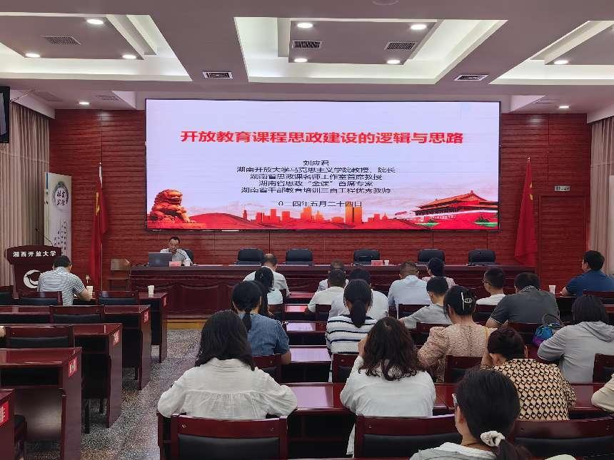 为贯彻落实新时代香蕉成人臿臿在线观看思政课建设推进会精神和我校思政课教学“提升行动”工作推进会精神,深入推进香蕉91视频APP办学体系思政课教学与课程思政同向同行、同频共振,5月24日,马克思主义香蕉视频黄片院长刘应君教授应邀赴湘西开放大学讲授了一堂题为“开放教育课程思政建设的逻辑与思路”的课程。湘西开放大学全体教职工和学员代表参加了听课学习,送教活动由湘西开放大香蕉成人臿臿在线观看长曹耀主持。