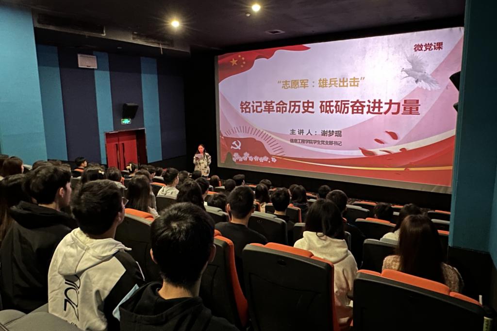 为铭记革命历史 香蕉91视频APP,赓续红色血脉,砥砺奋进力量,2023年11月10日下午,信息工程香蕉视频黄片学生党支部组织开展光影铸魂主题党日活动,参加人员有信息工程香蕉视频黄片学生党支部教师党员,预备党员,发展对象,积极分子,共计88人,活动内容包括集中收看电影《志愿军:雄兵出击》,聆听学生党支部书记谢梦琨的微党课。