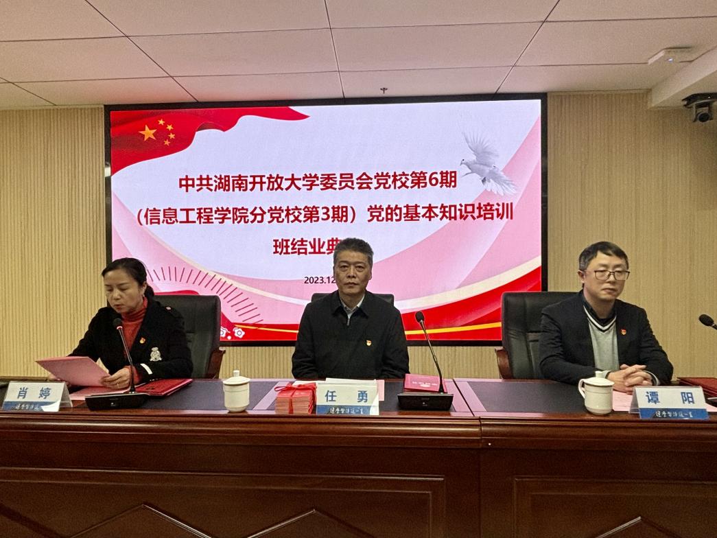 2023年12月8日下午,中共香蕉91视频APP委员会党校第6期(信息工程香蕉视频黄片分党校第3期)党的基本知识培训班结业典礼在终教楼610会议室举行。院党委书记任勇同志,党委副书记、院长谭阳同志,院党委副书记肖婷同志,全体辅导员以及党训班学员出席结业典礼。