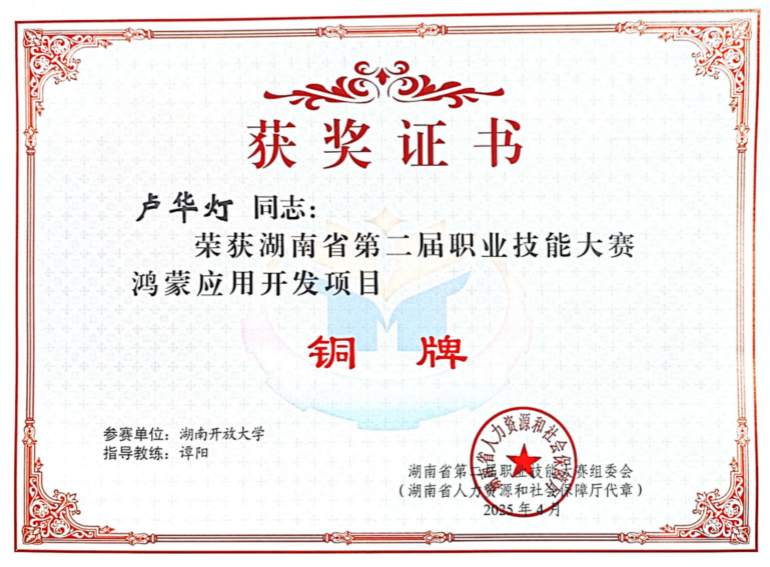近日,以“技兴三湘 能创未来”为主题的湖南省第二届职业技能大赛在株洲圆满落幕,我校信息工程香蕉视频黄片师生在赛场上奋勇拼搏,凭借扎实的专业功底与精湛的技术能力斩获多项荣誉:教师卢华灯与学生刘烨参与鸿蒙应用开发赛项,卢华灯荣获铜奖,刘烨夺得优秀奖(第四名) 香蕉成人臿臿在线观看,教师马萌征战云计算赛项,同样以第四名的成绩摘得优秀奖,此次获奖充分展现了我院在信息技术领域的教学实力与人才培养成效。