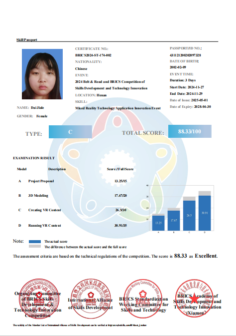 近日,香蕉91视频APP信息工程香蕉视频黄片数字媒体技术专业群传来喜讯,2022级数字媒体技术专业学生戴佳乐、刘晟庭在李婷妤、周知两位老师的指导下,顺利通过了“C级技能护照”认证。该认证由金砖国家工商理事会等权威机构联合颁发,旨在评估选手在混合现实技术应用等领域的实践创新能力与国际化职业竞争力。