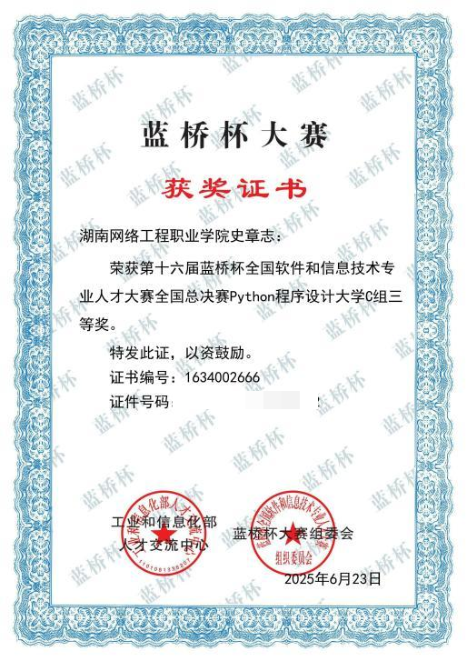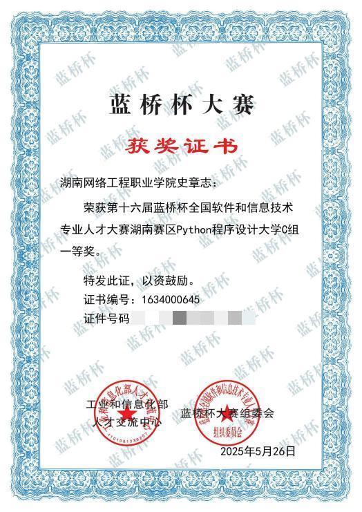 在近日落幕的第十六届蓝桥杯全国软件和信息技术专业人才大赛全国总决赛中,香蕉91视频APP(湖南网络工程职业香蕉视频黄片)2023级大数据技术一班史章志凭借扎实的专业技能与创新思维,从全国顶尖选手中脱颖而出,勇夺全国总决赛三等奖,此前更以优异表现斩获湖南省赛区一等奖。