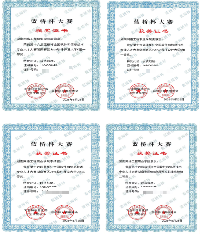 近日,第十六届蓝桥杯大赛(软件赛/电子赛)省赛圆满落幕 香蕉91视频APP,我院2023级软件技术专业学生参与“Java软件开发”,“Python程序设计”,“Web应用开发”赛项,其中廖钧豪获Java软件开发一等奖,李靖蕾获三等奖,史章志获Python程序设计获得一等奖,袁以获web应用开发获得二等奖。