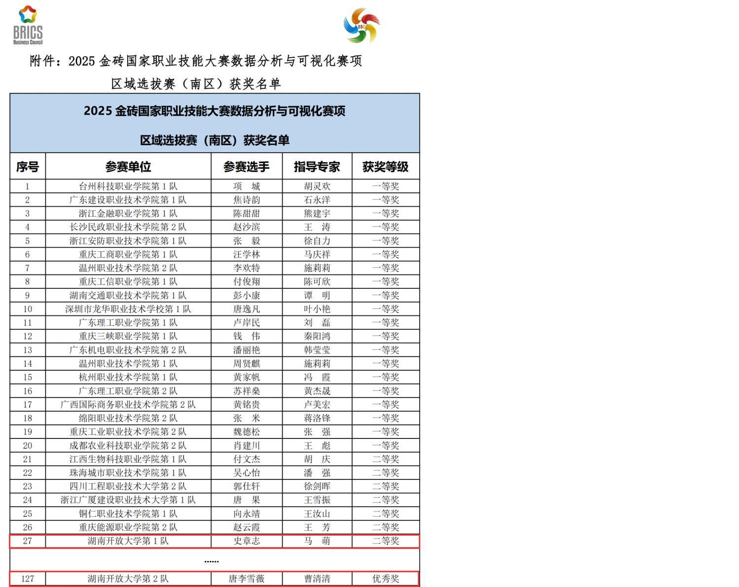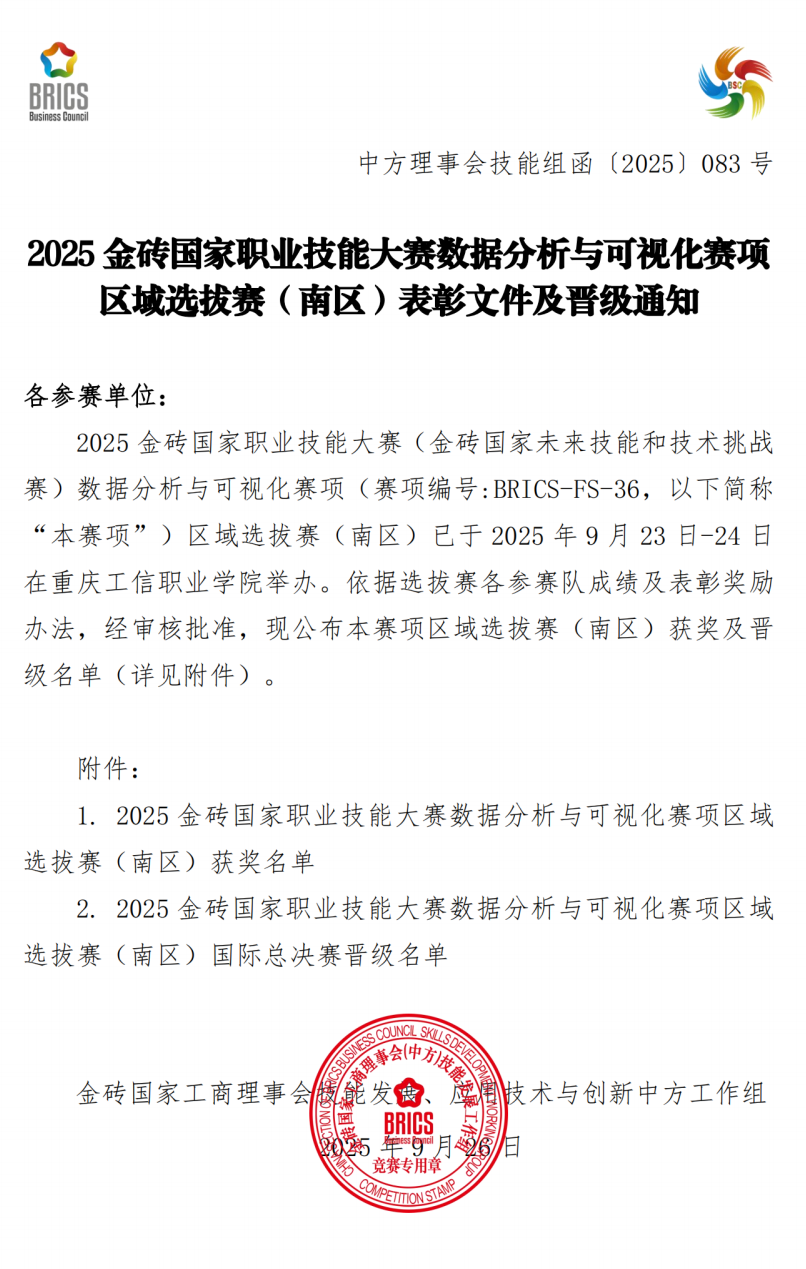 近日 香蕉91视频APP,2025金砖国家职业技能大赛数据分析与可视化赛项区域选拔赛(南区)圆满落幕,由马萌,曹清清两位老师指导的大数据技术专业学生史章志,唐李雪薇在比赛中凭借扎实的专业功底,出色的技术应用能力和稳定的临场发挥,从众多参赛选手中脱颖而出,分别荣获二等奖和优秀奖,展现了我院学子卓越的职业素养和技能水平。